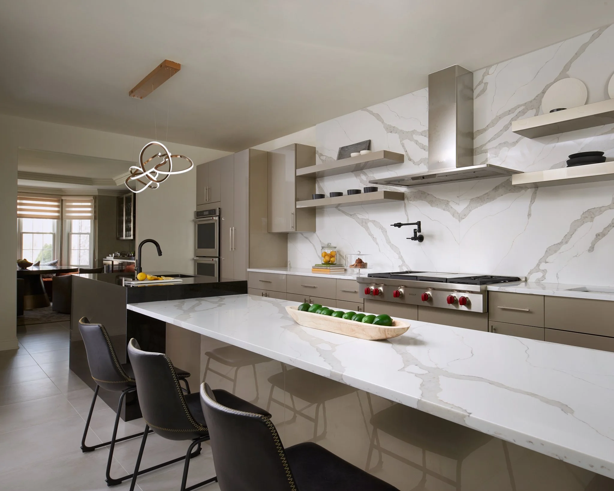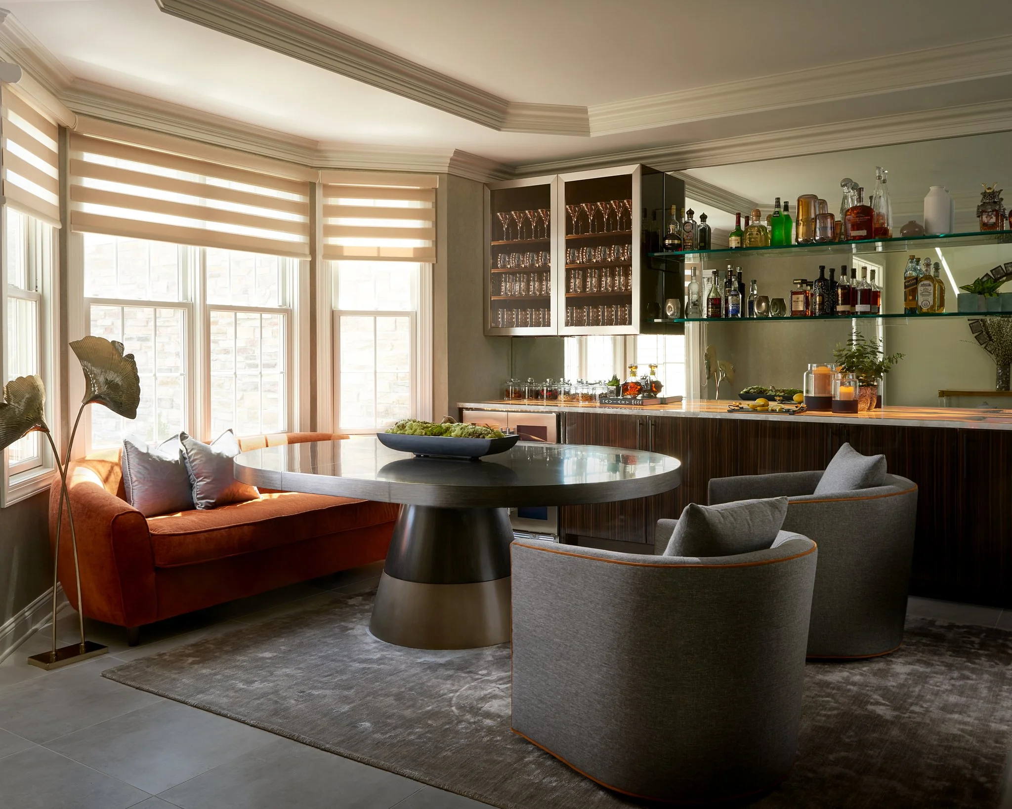 We created the new kitchen and bar lounge area in 2021 and it was completed in 2022. The kitchen was originally a small builder home basic kitchen that my clients quickly outgrew. Keeping their wishes in mind, we created a very modern and chic elongated galley kitchen but made sure that it felt open and expansive. Our clients requested that we turn their formal dining area into a lounge space that would be much more in line with their lifestyle. A custom bar was built along the back wall with mirrored backing and floating shelves and we wanted the bar to be functional, so we included a sink, dishwasher, and under counter wine fridge.