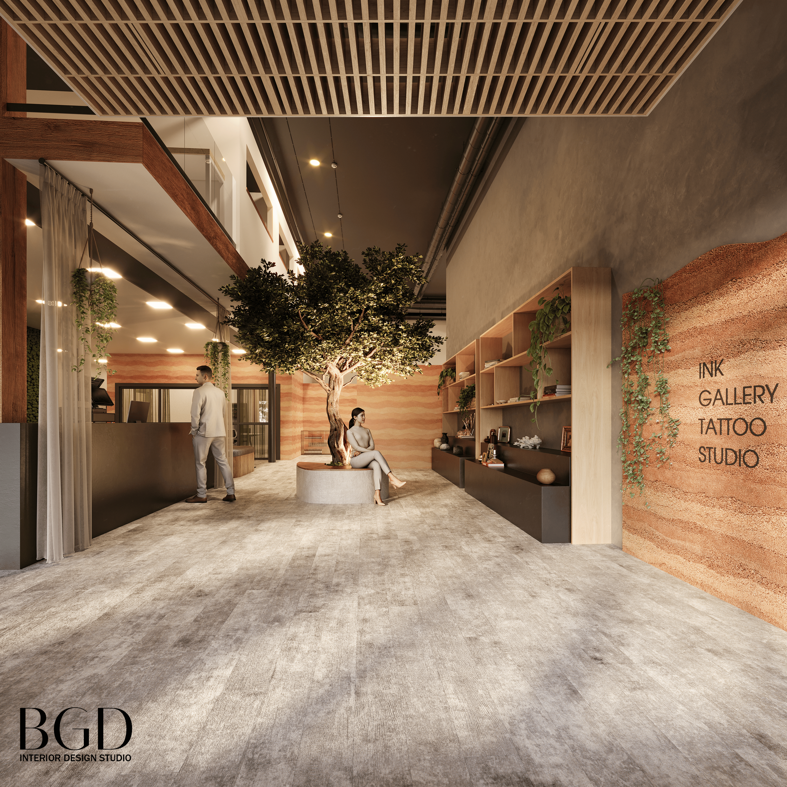 BGD approached the space as a sanctuary rather than a studio. Natural light, biophilic elements, and warm, organic materials were layered throughout to create a calming, grounded environment. A central tree installation anchors the space, acting as both a visual and energetic focal point. The result is a studio that feels equal parts gallery, ritual space, and creative home where art, healing, and intention meet.